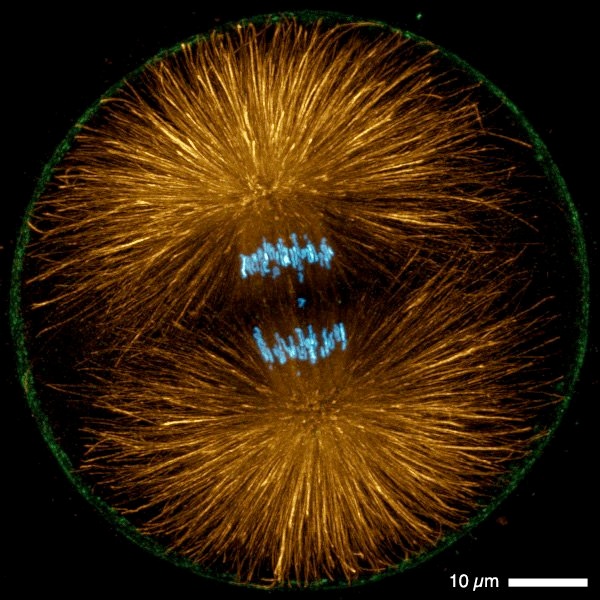 Antibody to tubulin (microtubules: orange), antibody to phosphorylated myosin (green), and Hoechst 33342 (DNA stain labels chromosomes: blue)